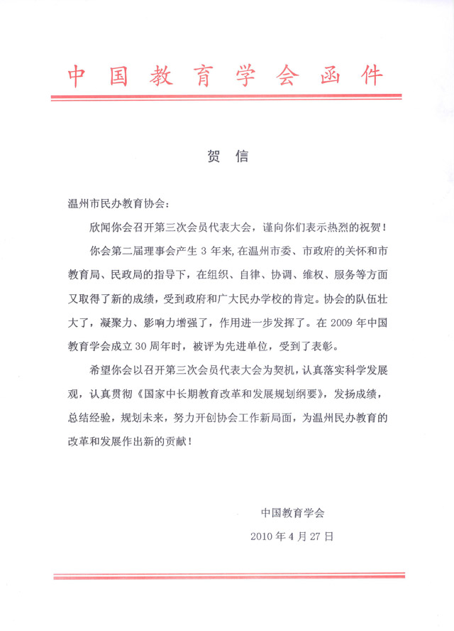 中国教育学会贺信