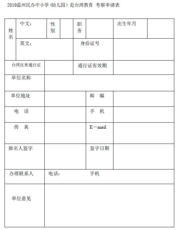 附件 1.2019 温州民办中小学(幼儿园)赴台湾教育考察申请表
